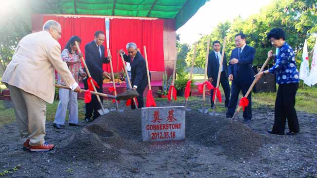 在东帝汶参加中东建交10周年活动的胡锦涛主席特别代表、全国政协副主席王志珍,东帝汶前总统拉莫斯·奥尔塔、副总理古特雷斯、外交部长科斯塔、驻华大使张芬霞等东帝汶政府官员,中国驻东大使田广凤、经商处参赞丁恬,欧盟驻东官员及其他外交使节,国际合作公司承建人员、中资公司及当地华人代表出席了奠基仪式。