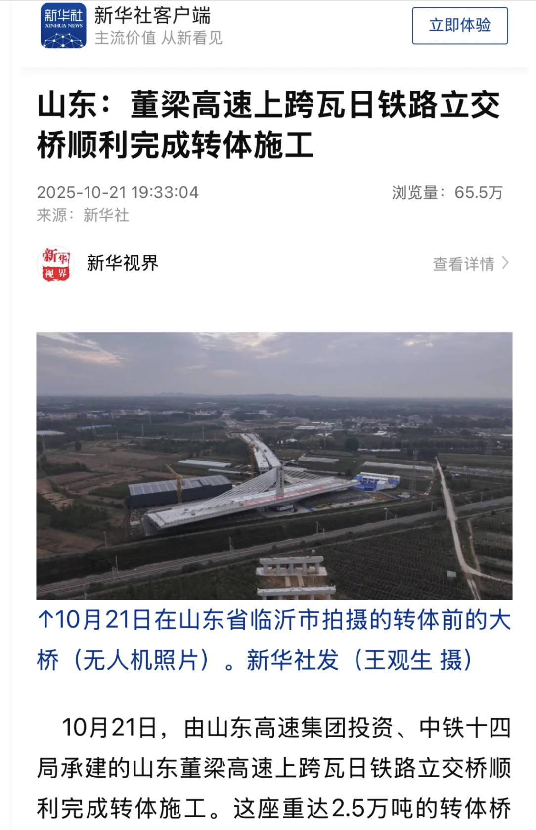 10月21日,由山东高速集团投资、中铁十四局承建的山东董梁高速上跨瓦日铁路立交桥顺利完成转体施工。这座重达2.5万吨的转体桥位于山东省临沂市,采用抗滑拉索体系,实现精准对接。董梁高速是国家高速公路网的重要组成部分,全线通车后将有效连接山东沿海地区与中西部,并强化与京津冀地区的交通联系,对促进区域协同发展和提升路网效能具有重要意义。