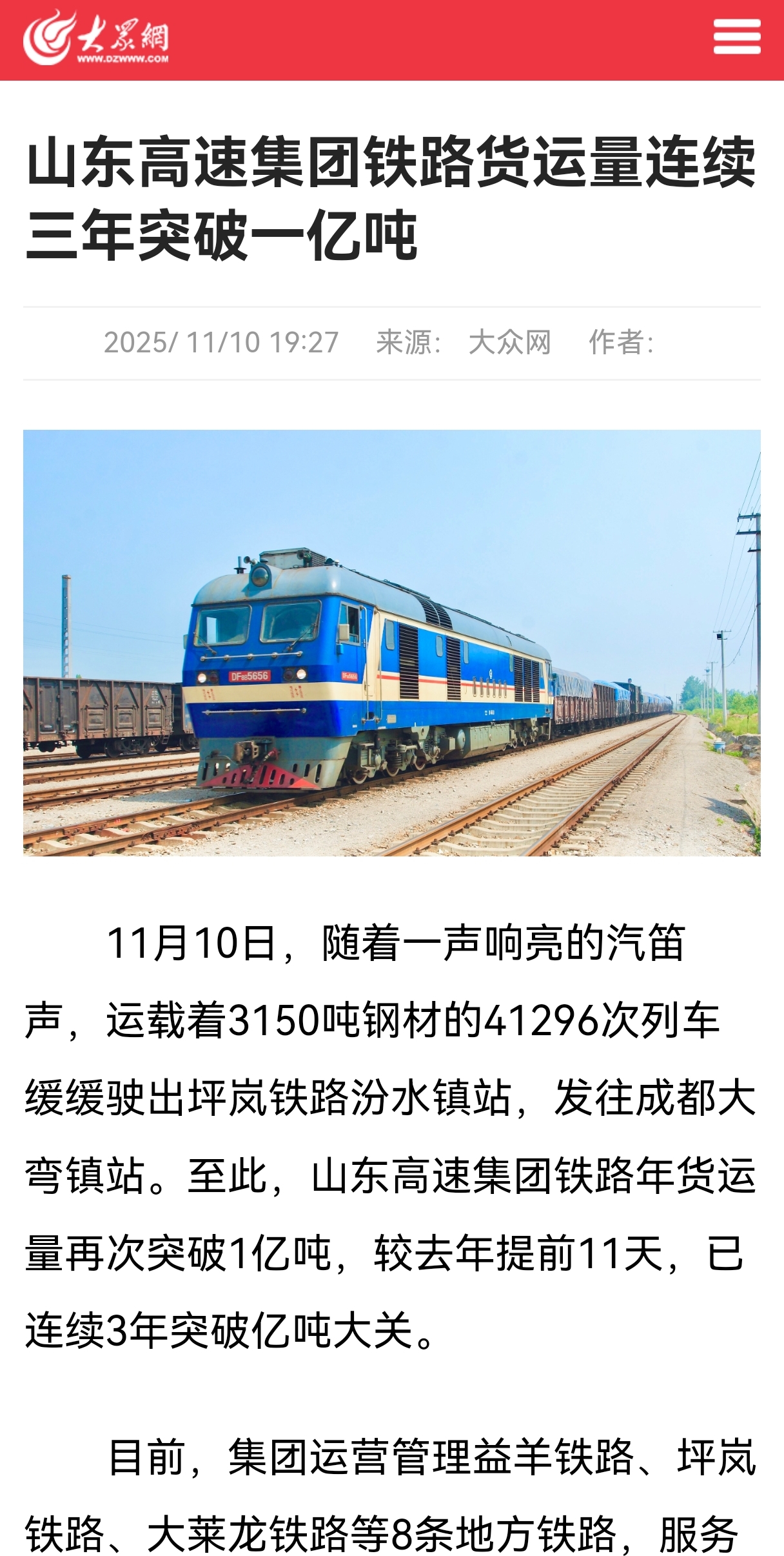 11月10日,随着一声响亮的汽笛声,运载着3150吨钢材的41296次列车缓缓驶出坪岚铁路汾水镇站,发往成都大弯镇站。至此,山东高速集团铁路年货运量再次突破1亿吨,较去年提前11天,已连续3年突破亿吨大关。