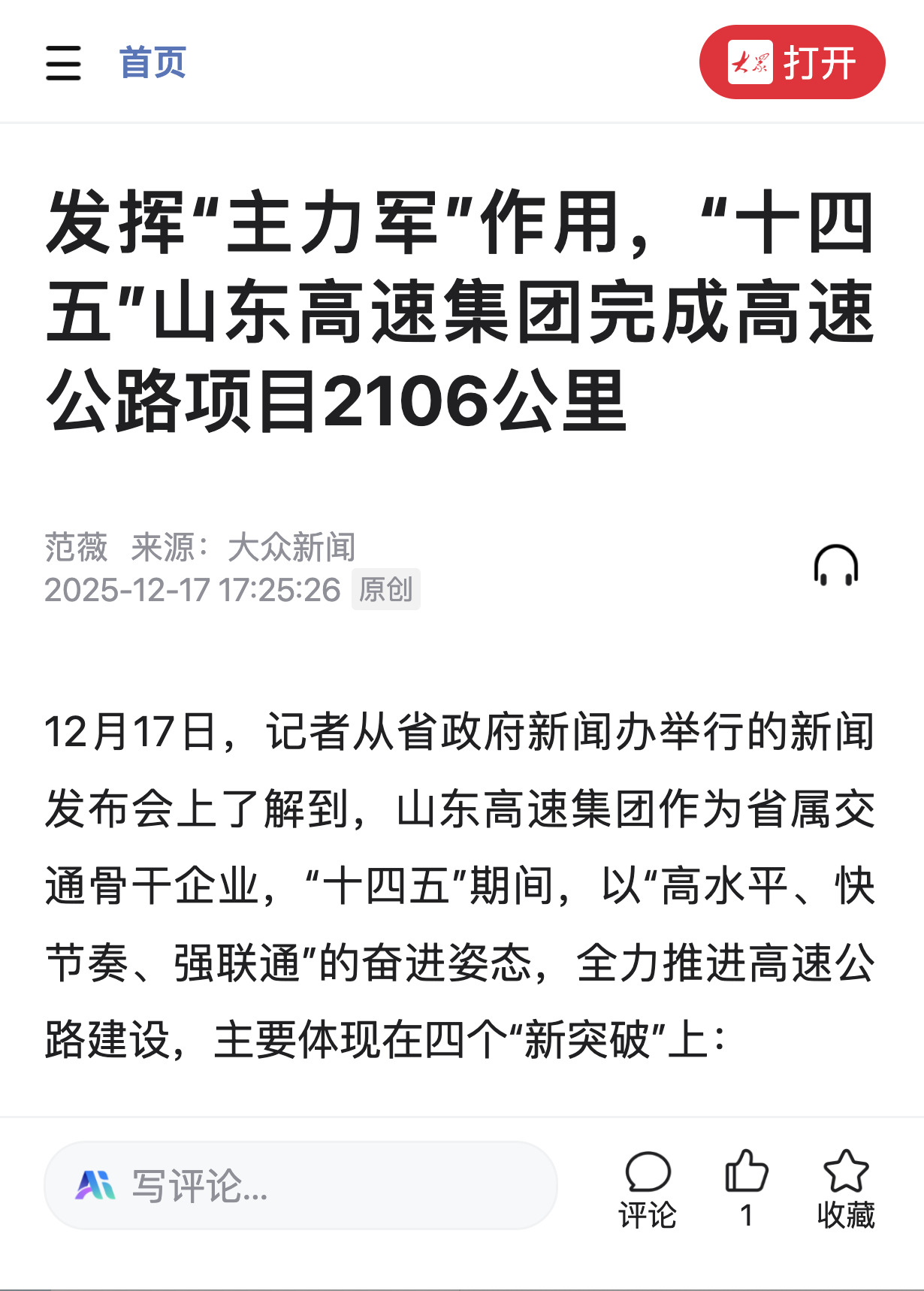 【大众日报】发挥“主力军”作用,“十四五”山东高速集团完成高速公路项目2106公里