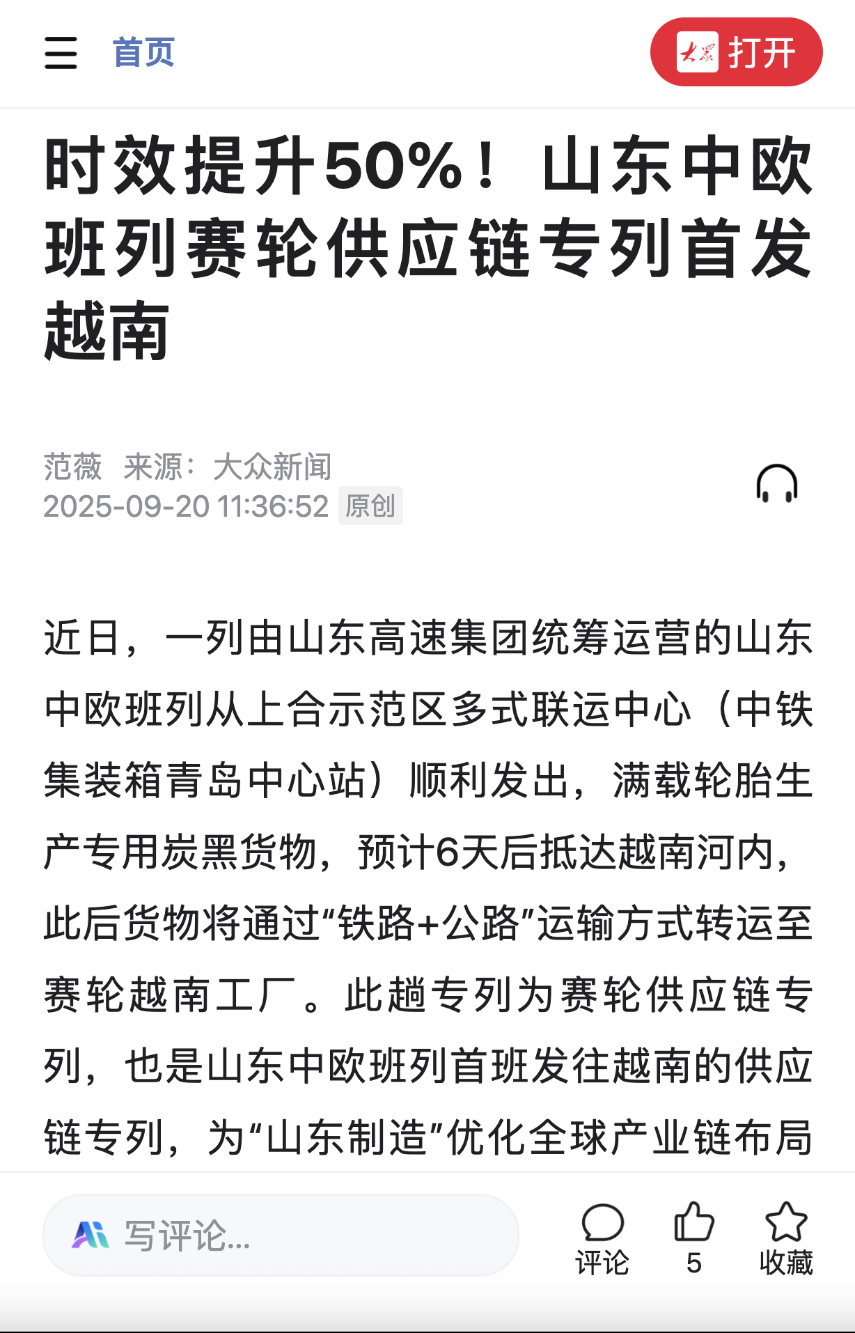 【大众新闻】时效提升50%!山东中欧班列赛轮供应链专列首发越南
