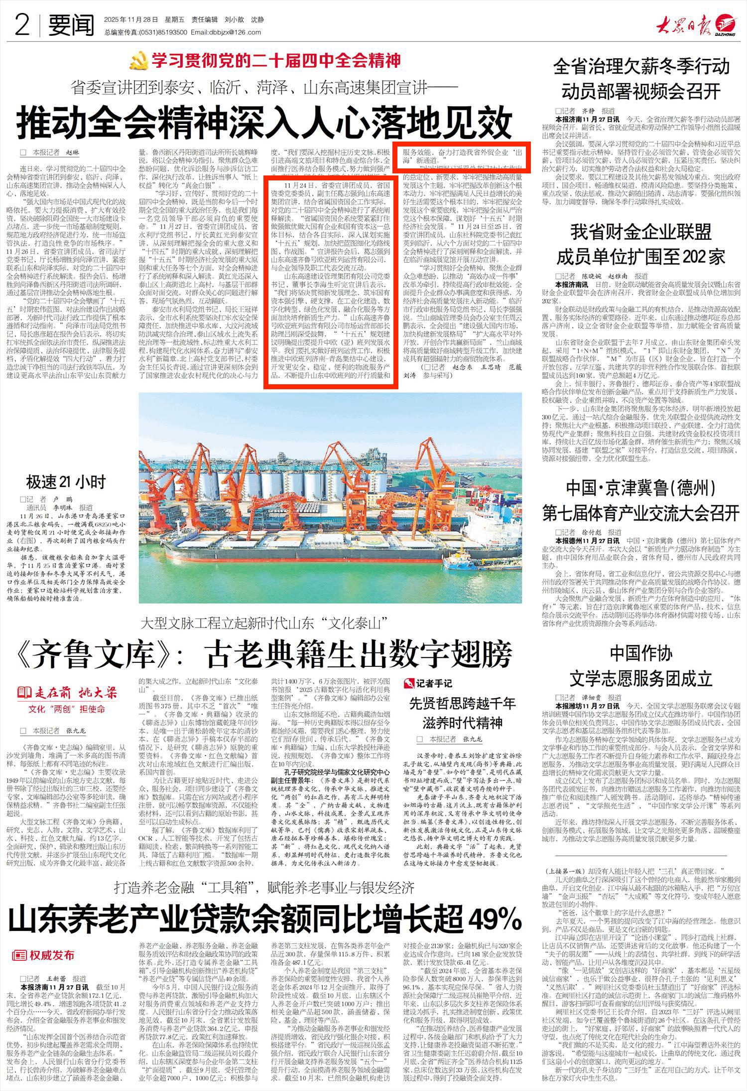 11月24日,省委宣讲团成员,省国资委党委委员、副主任葛志强到山东高速集团宣讲,结合省属国资国企工作实际,对党的二十届四中全会精神进行了系统阐释解读。“省属国资国企系统要紧紧盯住做强做优做大国有企业和国有资本这一总体目标,结合各自实际,深入谋划实施‘十五五’规划,加快把蓝图细化为路线图、作战图。”宣讲报告会后,葛志强到山东高速齐鲁号欧亚班列运营有限公司,与企业领导及职工代表交流互动。